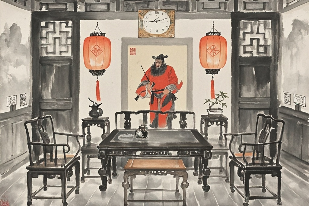 • 钟馗画像:作为驱邪避凶的代表,钟馗画像挂在客厅中堂,能够坐镇客厅,稳定气场。在风水布局中,中堂是客厅的核心位置,如同人的心脏,钟馗的力量可以守护全家平安。