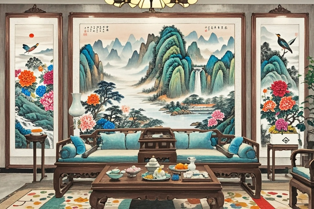中式传统风格的居室,深色木质家具居多,适合选择色调沉稳、意境深远的传统风水画。墨色山水、金色花鸟或红色吉祥图案都能与中式风格完美融合,营造出典雅祥和的氛围。