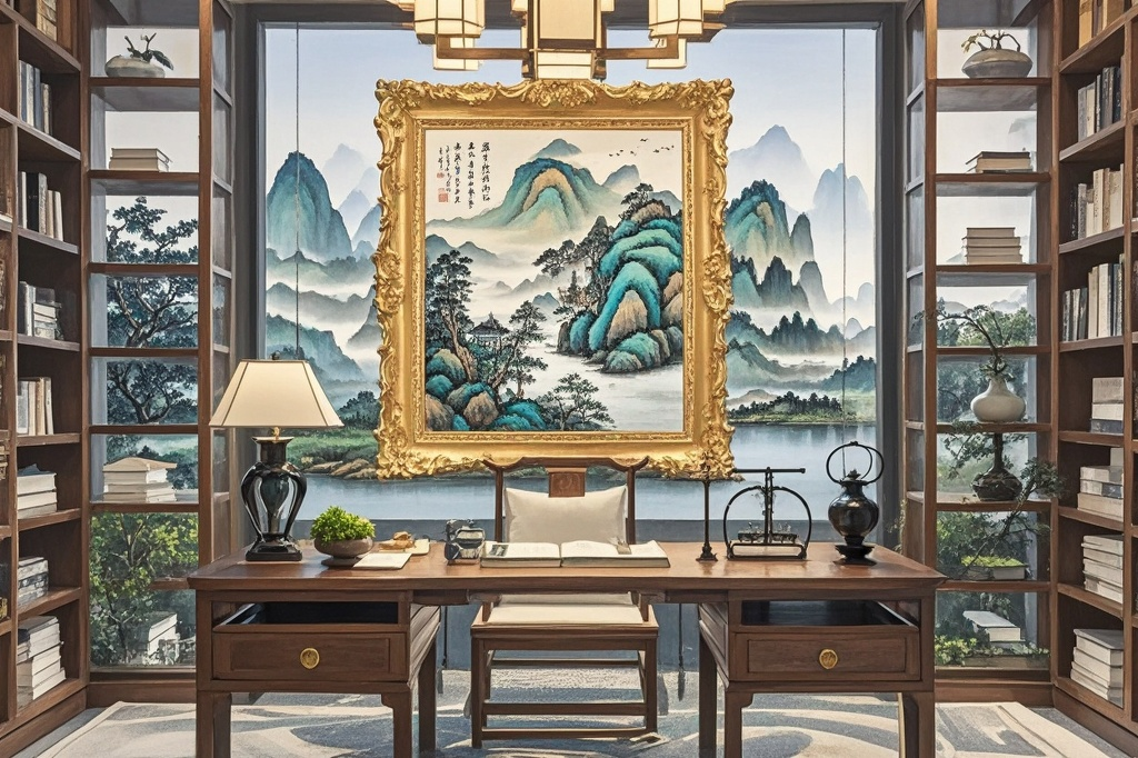 金色画框不仅仅是装饰,更是一种能量的引导者。它像一位智慧的引路人,指引着我们在这个充满知识与灵感的空间中找到属于自己的节奏和方向。每一缕金色的光芒,都在诉说着千年的风水智慧,提醒我们与环境和谐共处的重要性。