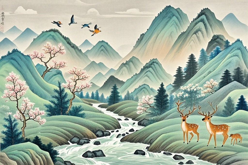 查自起先生的《春山如笑》系列,以淡雅的青绿色调描绘春日山景,蕴含着木元素的生机活力,特别适合五行缺木的孩子。画中溪流潺潺、山峦叠翠,为孩子营造出一个充满生机却又宁静致远的睡眠环境。