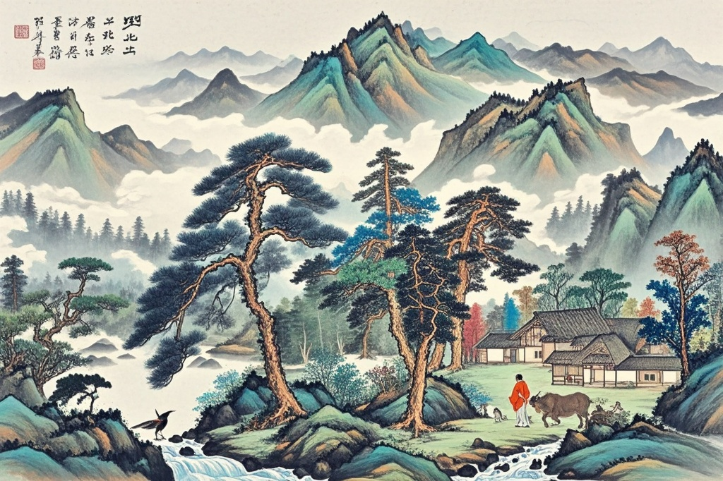 画中要有生机勃勃的元素,如青松翠柏、飞鸟走兽、流水人家等。这些元素代表着生命的活力和希望,能够增强画作的吉祥寓意。
