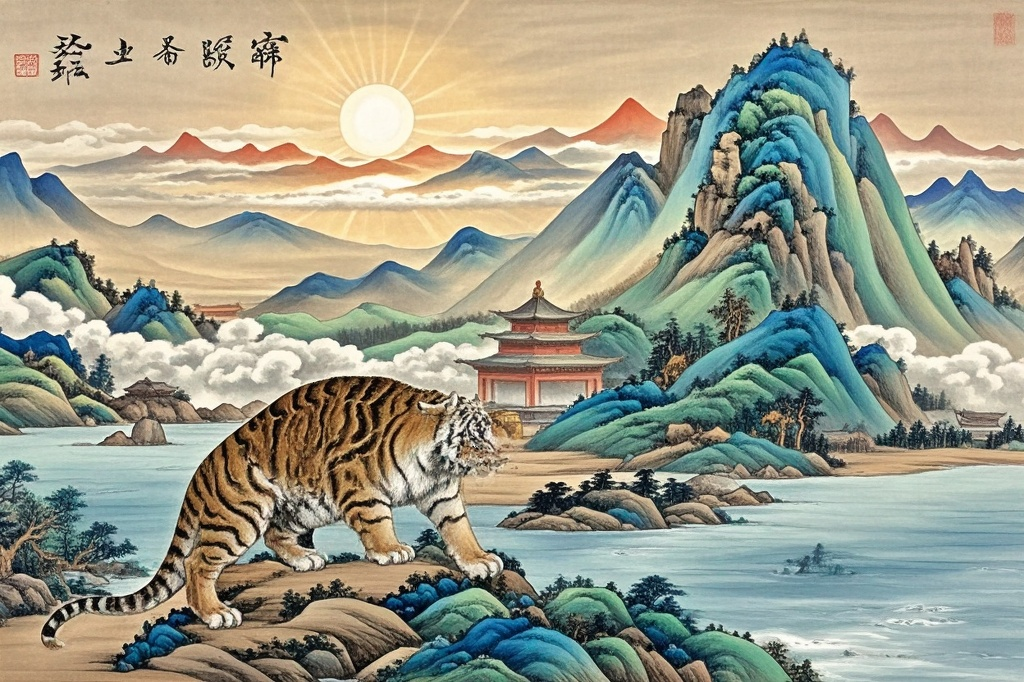 右侧白虎镇守:画面右侧的山石或建筑,代表着权力和威严。白虎位要相对平和,不能过于张扬。