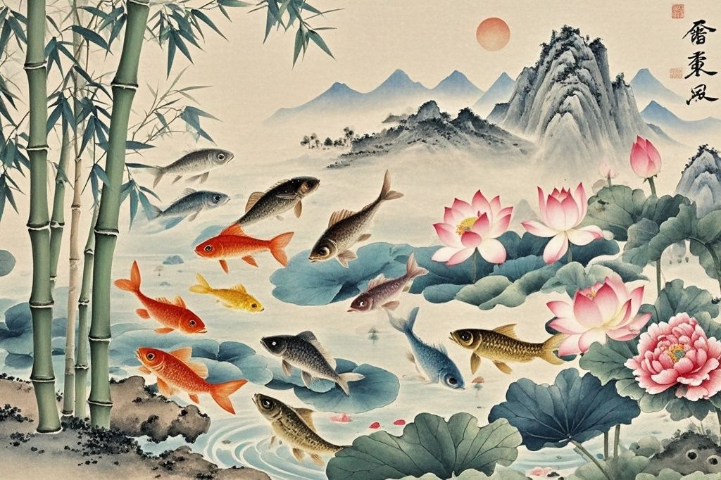 2. 众鱼嬉水字画:年年有余的吉祥寓意
