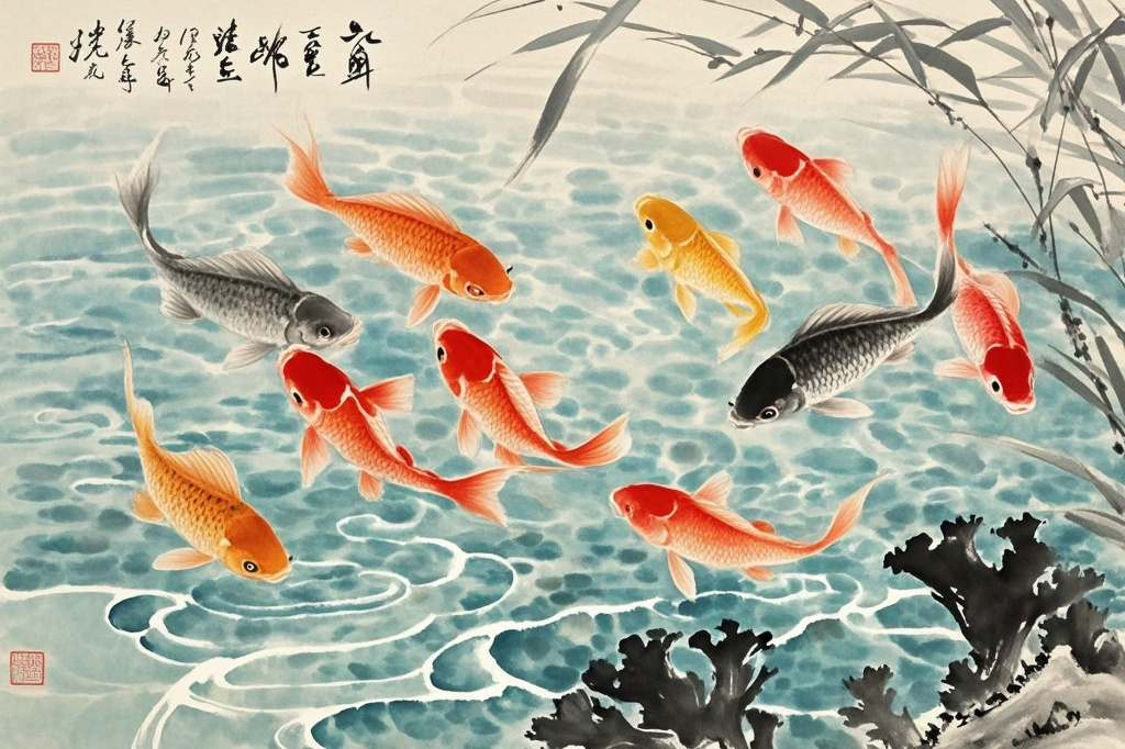 在众多风水画中,九鱼图堪称夫妻卧室的首选。九条活泼的游鱼在水中嬉戏,象征着夫妻关系的和谐美满。”九”在传统文化中代表着长久和圆满,而”鱼”则与”余”谐音,寓意年年有余、生活富足。