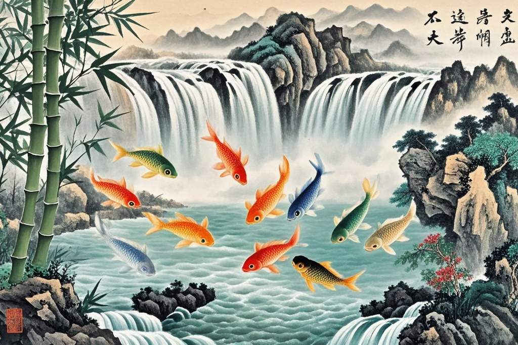 九鱼图是能够带来事业好风水的最佳选择之一。数字"九"在传统文化中象征着长长久久,对书房主人的事业和学业有一个长久的支撑作用。九条游动的鱼代表着生机勃勃,在以后的工作和学习中能给书房主人带来贵人的相助。