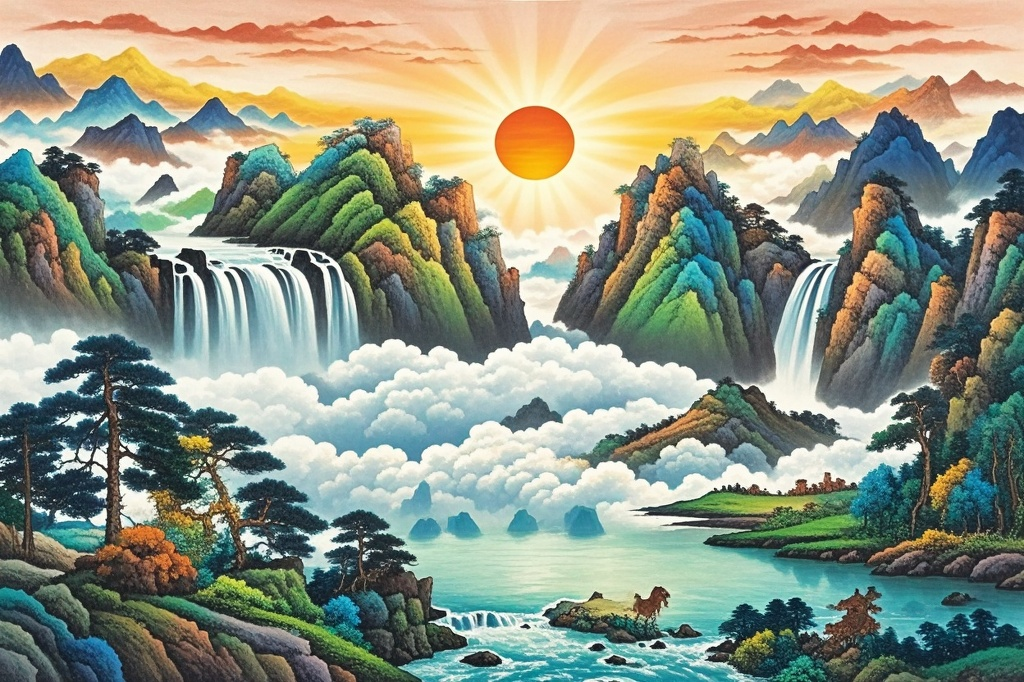 布局合理:画面中要有高山为靠,流水为财,红日为运,形成完整的风水格局。